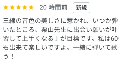 普段は、琉球古典音楽奏者として日々稽古に励んでおり、栗山さんと同じく、安冨祖流・師範の西江喜春先生に師事させていただいてます。栗山さんは、沖縄県立芸術大学・琉球古典音楽専攻出身の先輩でもあります。私は現在、三線をたくさんの方に知って欲しいという願いから、アーティスト活動を行っております。栗山さんのように三線を心から愛し、想いを持って教えてくれる先生への架け橋が私の役目だと思います。〝いーどぅし〟の歌をお聴きになって、もし、三線に興味が湧いたのなら…3つの弦から聞こえる沖縄の音色を栗山さんのもとでぜひ体感して欲しいです!