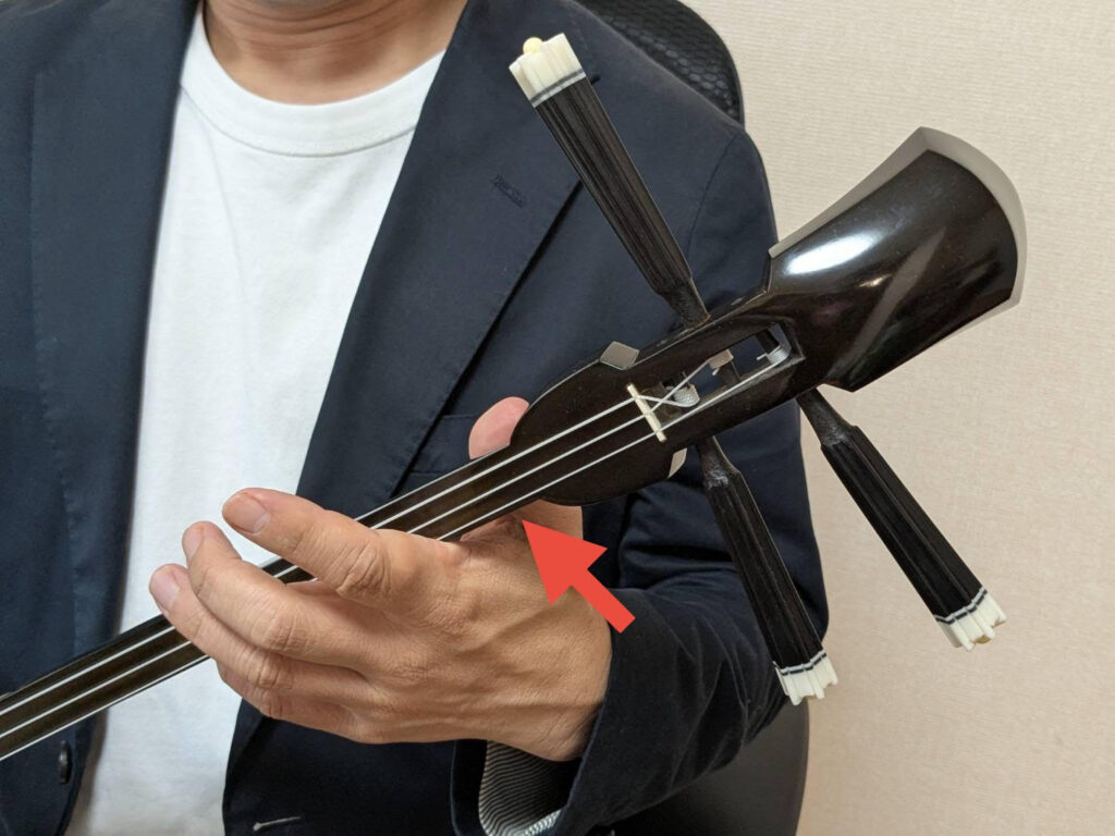 三線の勘所「尺」は、中弦を小指で押さえる重要な勘所です。