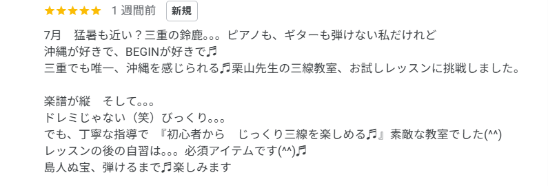 【三重 鈴鹿 三線教室】「三重でも唯一、沖縄を感じられる三線教室」Google口コミ紹介