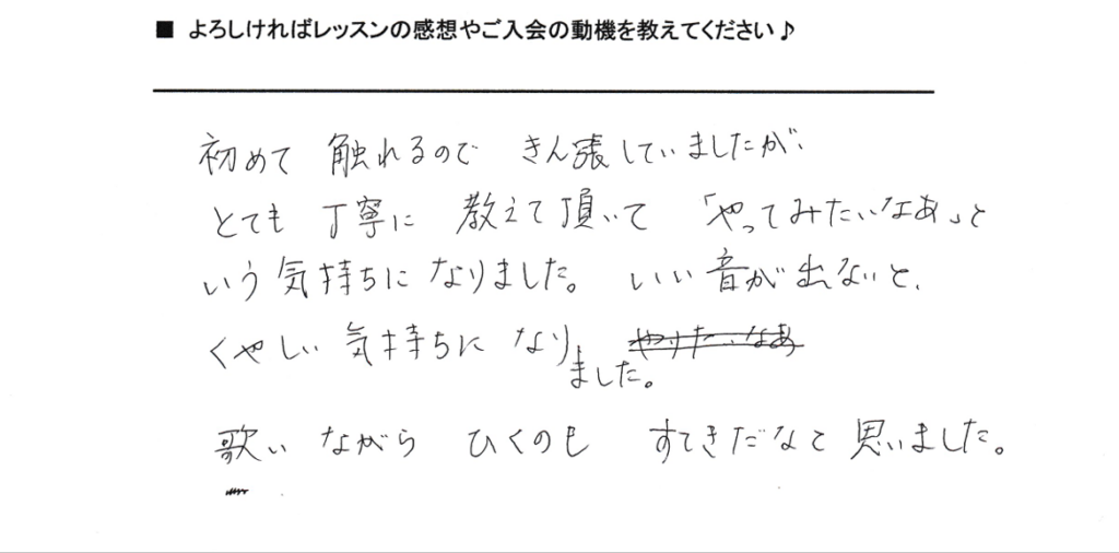 「初めて触れるので緊張していましたが、とても丁寧に教えていただいて、やってみたいなという気持ちになりました。良い音が出ないと悔しい気持ちになりました。歌いながら弾くのも素敵だなと思いました」というご感想をいただきました。