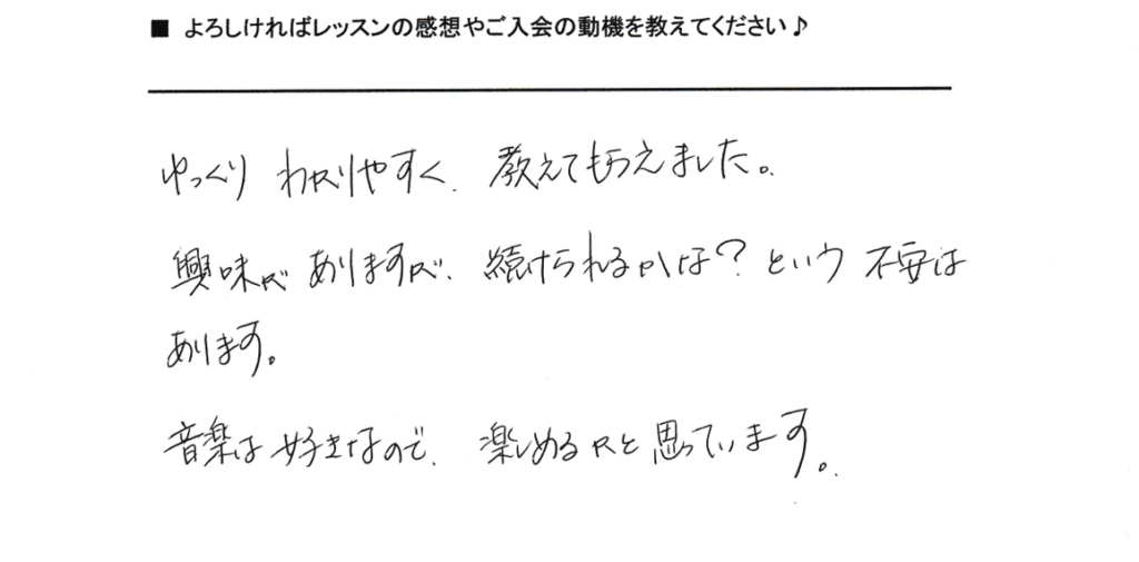 「ゆっくりわかりやすく教えてもらえました。興味はありますが、続けられるかなという不安もあります。音楽が好きなので楽しめるかと思っています」というご感想をいただきました。