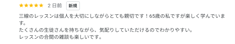 三線のレッスンは個人を大切にしながらとても親切です!65歳の私ですが楽しく学んでいます。