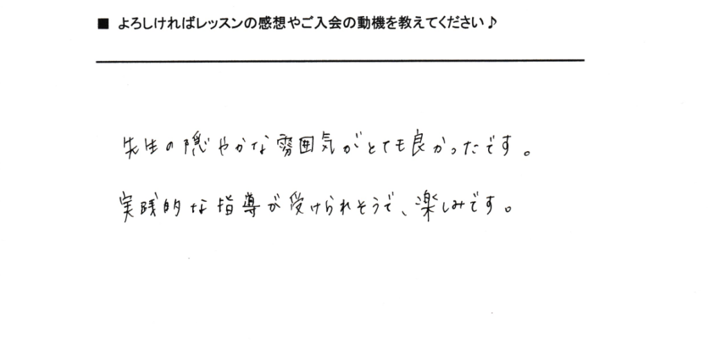 先生の穏やかな雰囲気がとても良かったです。実践的な指導が受けられそうで楽しみです。